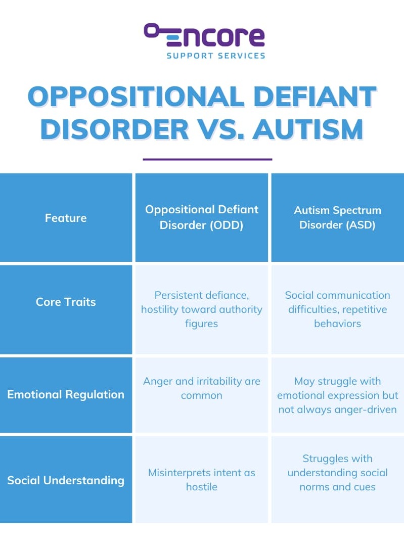 Although ODD and autism share some overlapping behaviors, such as tantrums or refusal to cooperate, their underlying causes and manifestations differ: